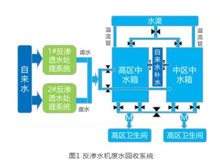 經過對反滲水處理系統工作原理的調研,并結合前端終端的水量監測,我們在反滲水處理系統的廢水終端建立了廢水回收系統。廢水回收系統主要面向反滲透處理第一階段的過濾、消毒、吸附以及第二階段的反滲透一級和二級處理所產生的廢水,系統結構如圖1所示。其原理是通過處理設備與中水池之間的自然高差,將處理設備產生的廢水直接回收到了高區中水箱與中區中水箱中。其水質無需經過任何處理,即可達到院區病房和公共區域的中水及灌溉標準。此外,當中水不足時以自來水補充水箱,中水過量時設計溢流管向水渠分流,共同構建了基于反滲水機廢水回收系統的醫院中水體系,實現了反滲水處理系統廢水排放的回收利用,基本滿足了醫院的中水及灌溉需求。