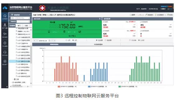 天津市北辰醫院于2018年11月引進了遠大科技集團的醫院能耗監測平臺項目[4],該項目以智能計量系統為代表,主要涵蓋了醫院各科室安裝智能遠傳電表、智能遠傳水表、后勤一站式報修系統。醫院在項目基礎上建立了后勤運營智能管控平臺,將反滲水處理系統的信息納入到平臺管理中,實時監測處理系統的工作狀態,管理界面如圖3所示。廢水回收系統進水和排水數量的監測,是分析研判回收系統運維狀態的重要依據。同時,智能平臺的應用層控制,實現了回收廢水和節約用水的直觀量化,提高了設備安全運行的可靠性。